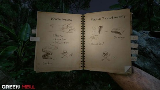 Beyond the environment, Green Hell distinguishes itself through its intricate Body Inspection system. Players cannot simply "apply a bandage" to heal. Instead, they must manually inspect their limbs to identify the specific type of wound before selecting the correct treatment from their backpack. In moments of heavy bleeding, a few seconds of fumbling can mean the difference between life and death.